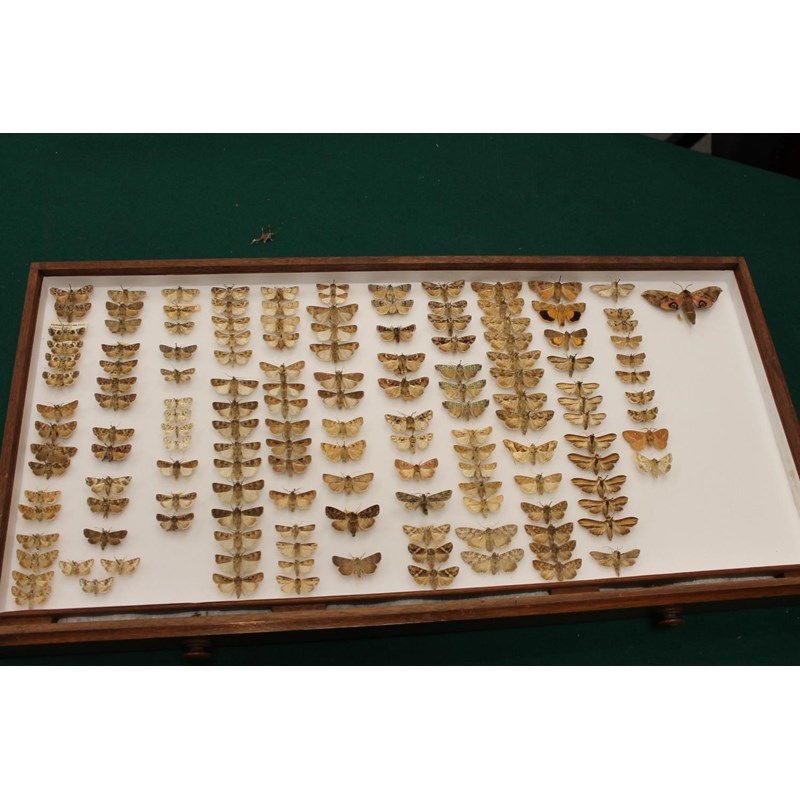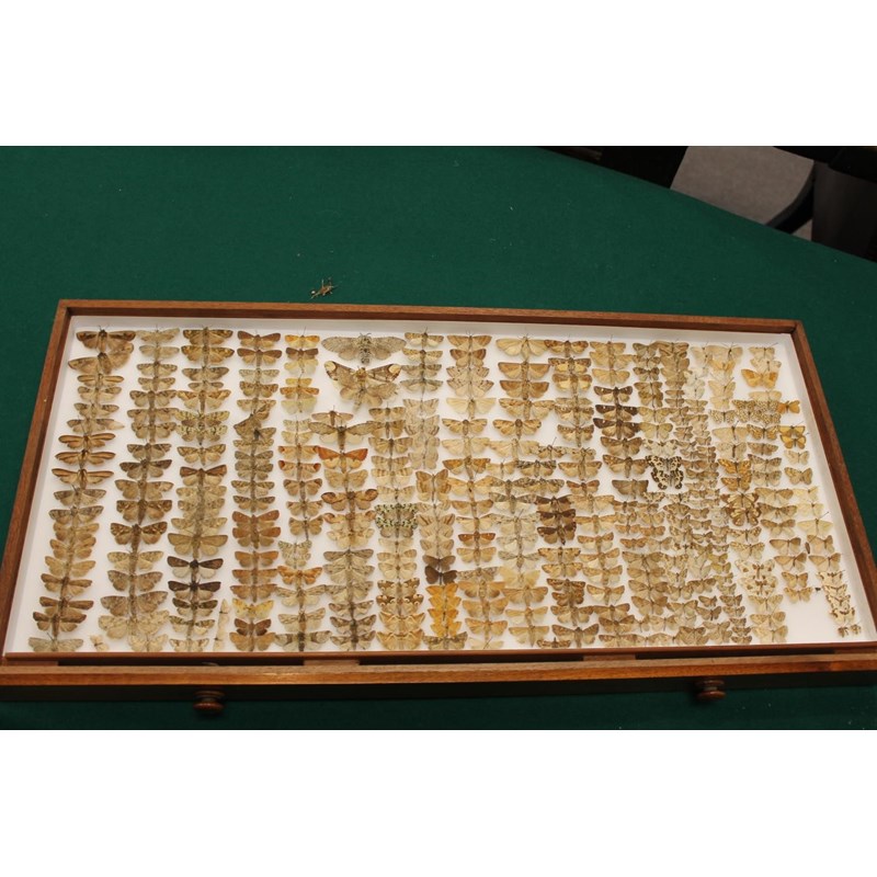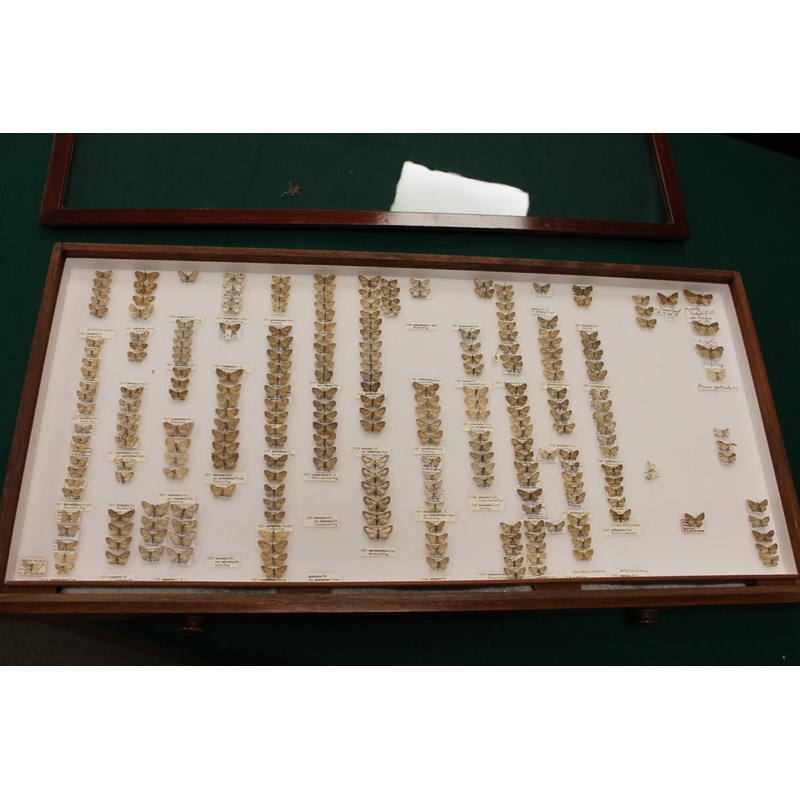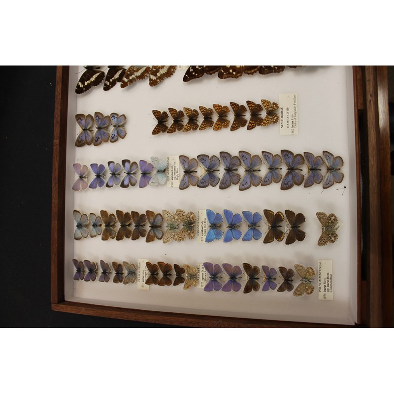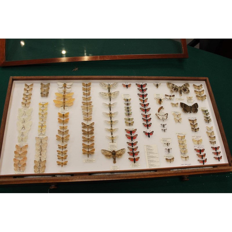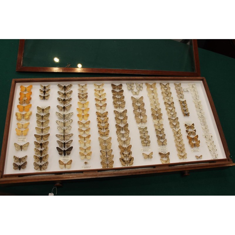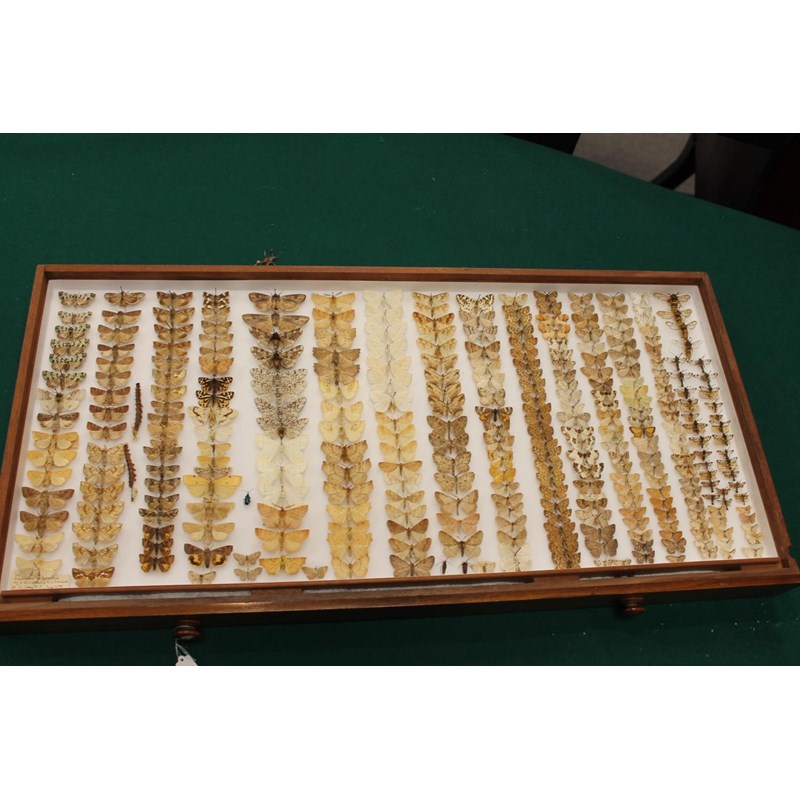 a walnut collectors cabinet with 18 long glazed drawers with a variety of moth and butterfly specimens, many with information and dates including some from older collections. The cabinet with a retail label for Watkins & Doncaster, Naturalists, London. Specimens include Clouded Magpie, Peacock Moth, Speckled Yellow, Orange Moth, Common Heath, Dotted Carpet, Goat Moth, Scarce Forester, Leopard Moth, various 'Pug' moths, Swallowtail, Orange Tip, Large Skipper, Holly Blue, Chalk Hill Blue, Painted Lady, Small Heath, Scotch Argus, Scarce Dagger, and many more. Some drawers empty or sparse. Cabinet 113cms high, 75cms across