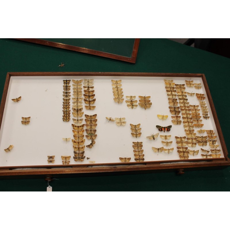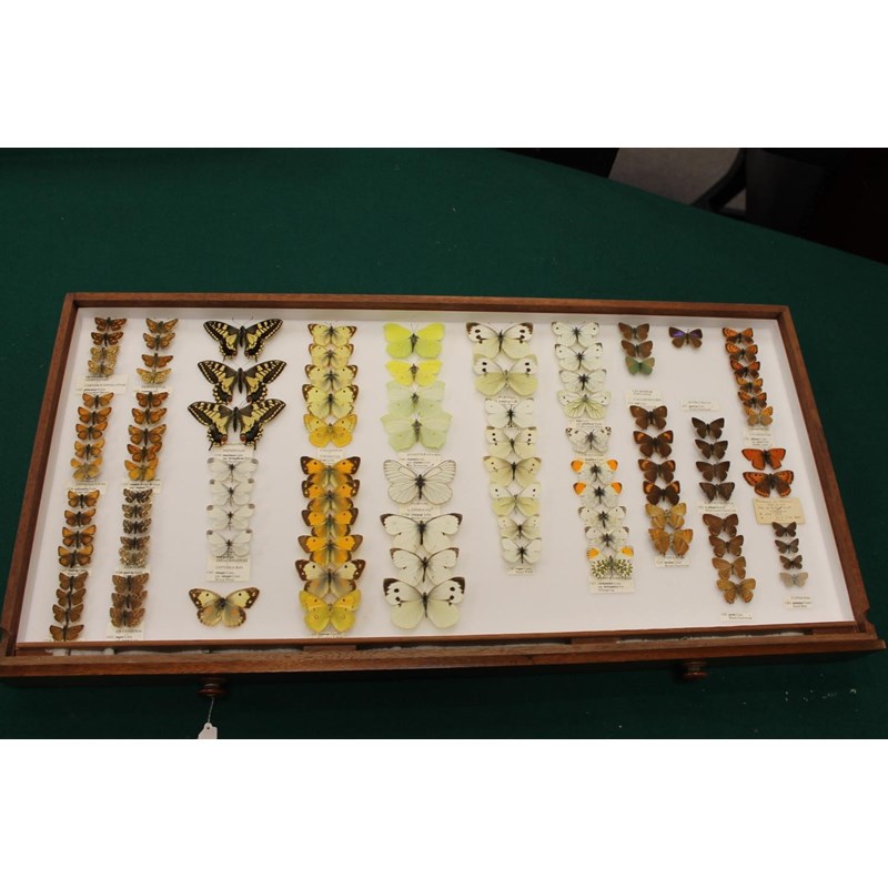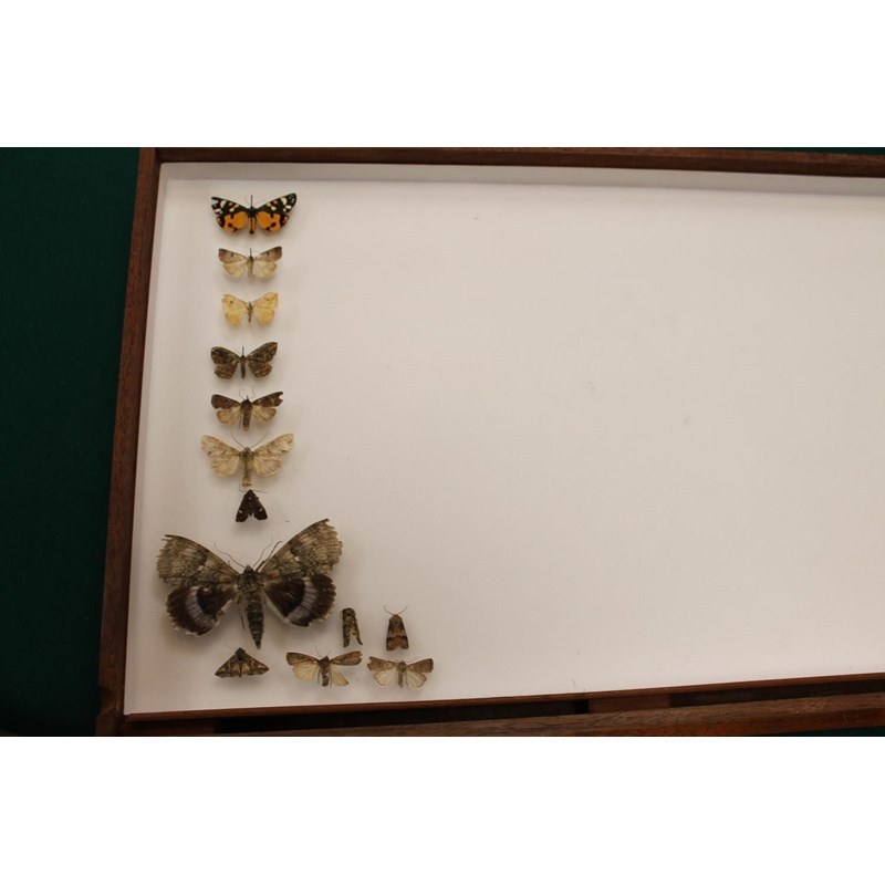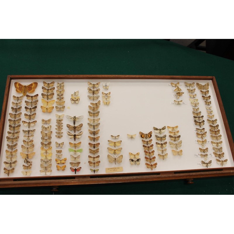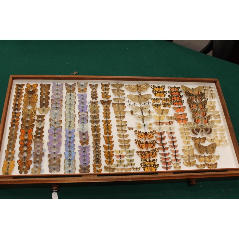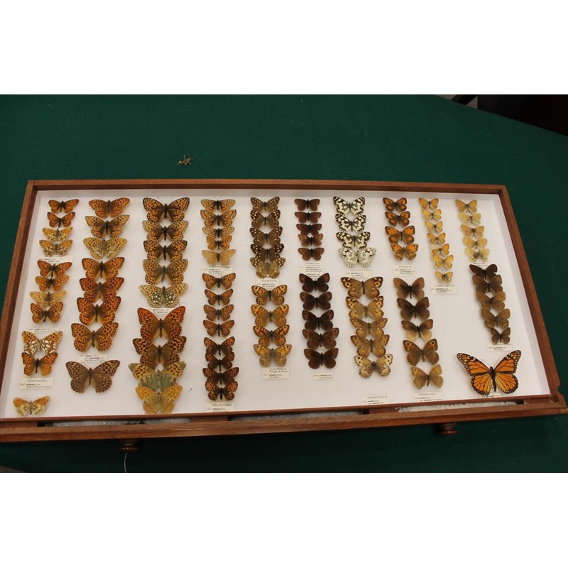 a walnut collectors cabinet with 18 long glazed drawers with a variety of moth and butterfly specimens, many with information and dates including some from older collections. The cabinet with a retail label for Watkins & Doncaster, Naturalists, London. Specimens include Clouded Magpie, Peacock Moth, Speckled Yellow, Orange Moth, Common Heath, Dotted Carpet, Goat Moth, Scarce Forester, Leopard Moth, various 'Pug' moths, Swallowtail, Orange Tip, Large Skipper, Holly Blue, Chalk Hill Blue, Painted Lady, Small Heath, Scotch Argus, Scarce Dagger, and many more. Some drawers empty or sparse. Cabinet 113cms high, 75cms across