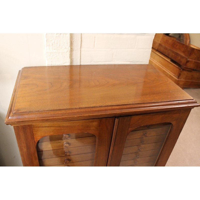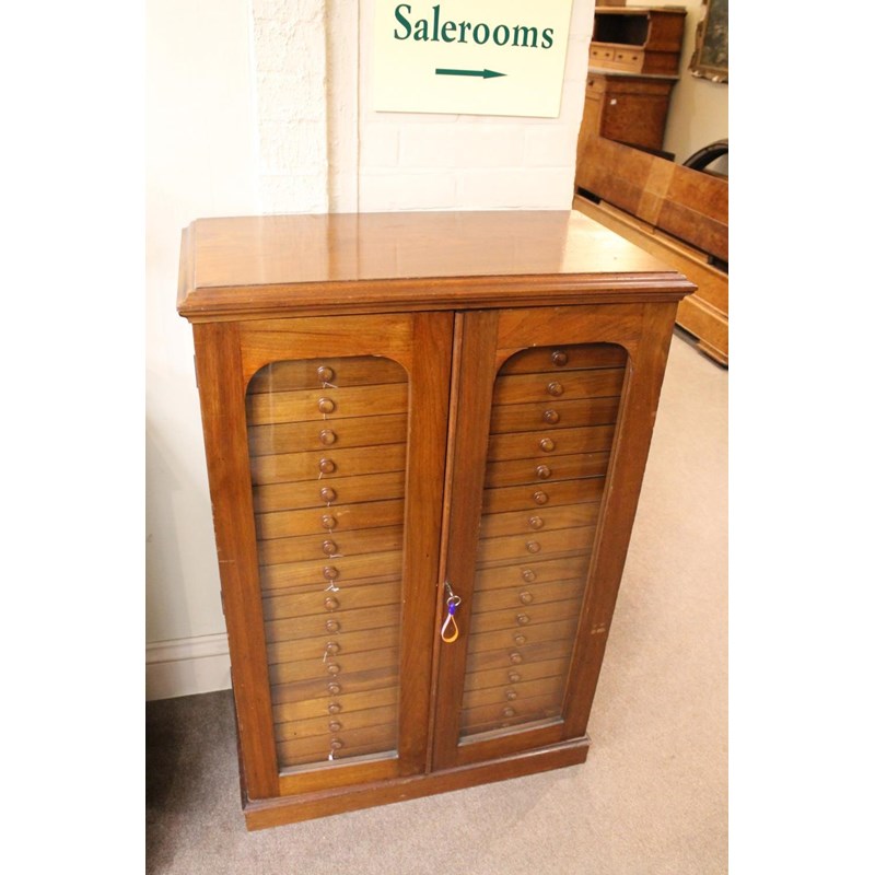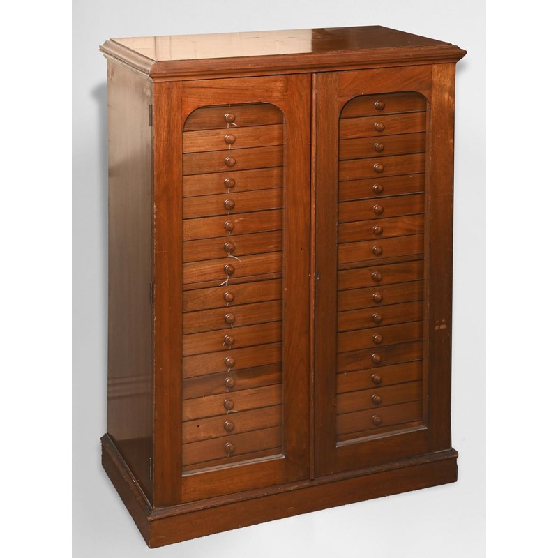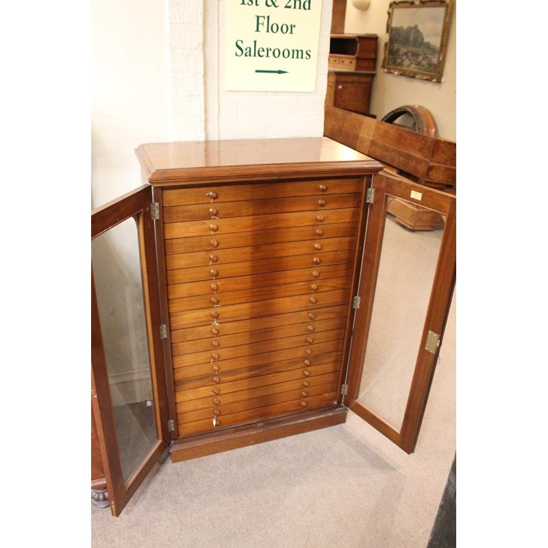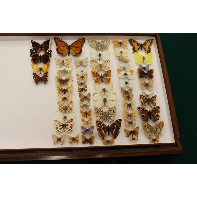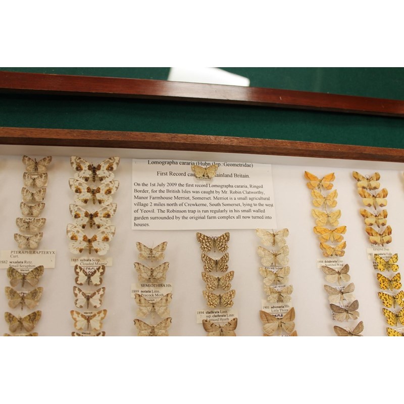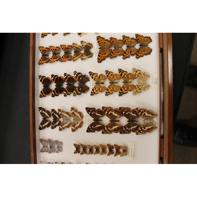 a walnut collectors cabinet with 18 long glazed drawers with a variety of moth and butterfly specimens, many with information and dates including some from older collections. The cabinet with a retail label for Watkins & Doncaster, Naturalists, London. Specimens include Clouded Magpie, Peacock Moth, Speckled Yellow, Orange Moth, Common Heath, Dotted Carpet, Goat Moth, Scarce Forester, Leopard Moth, various 'Pug' moths, Swallowtail, Orange Tip, Large Skipper, Holly Blue, Chalk Hill Blue, Painted Lady, Small Heath, Scotch Argus, Scarce Dagger, and many more. Some drawers empty or sparse. Cabinet 113cms high, 75cms across
