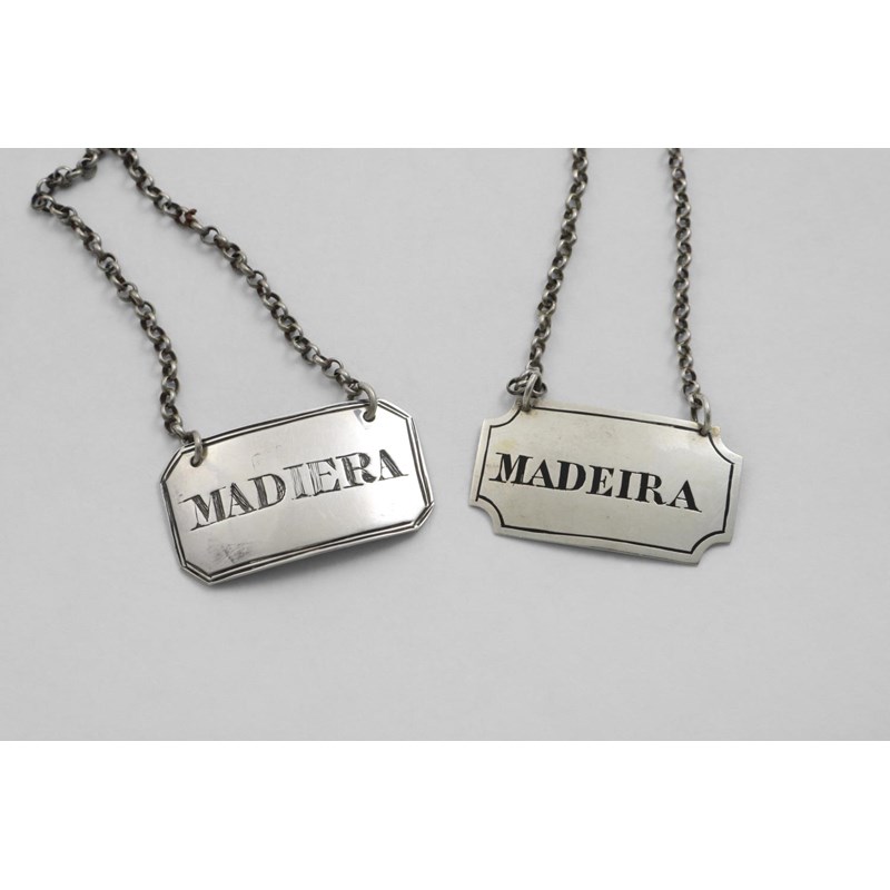 with incurved corners, an incised border and title "MADEIRA" (with infill), buy John Pringle of Perth (I.P, eagle) c.1840 and a Scottish canted oblong label with a thread border incised "MADIERA"*, by Robert Gray & Sons (of Glasgow), hallmarked Edinburgh 1818; the latter 1.7" (4.2 cms) long; 0.6 oz (2)