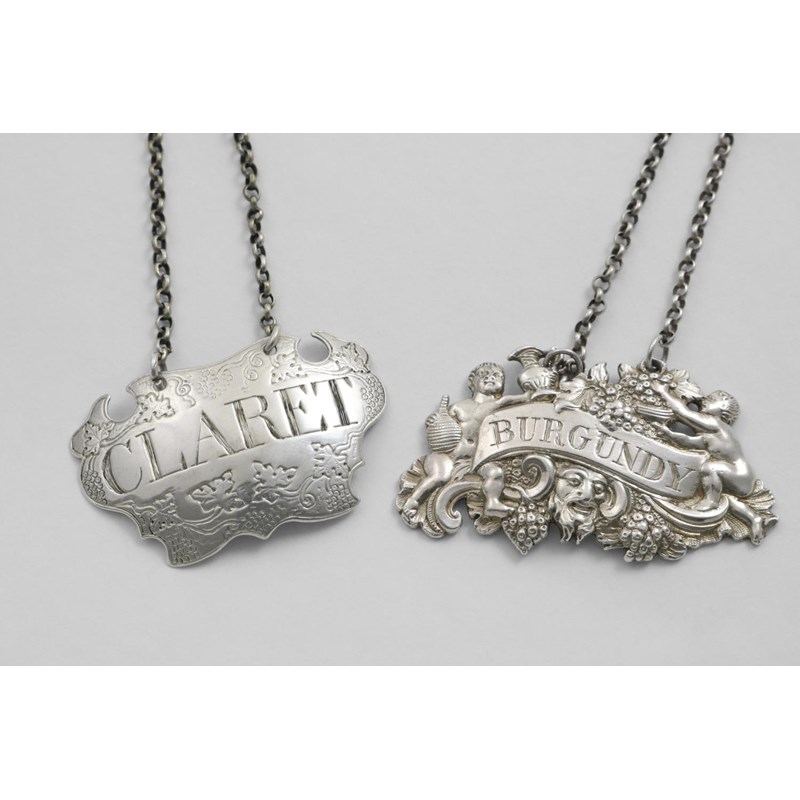 by Sandilands Drinkwater: a "CLARET" escutcheon with chased borders and a cast Bacchanalian "BURGUNDY", each with maker's mark & lion passant only, London c.1745; the latter 2.5"  (6.5 cms) long;  1.1 oz