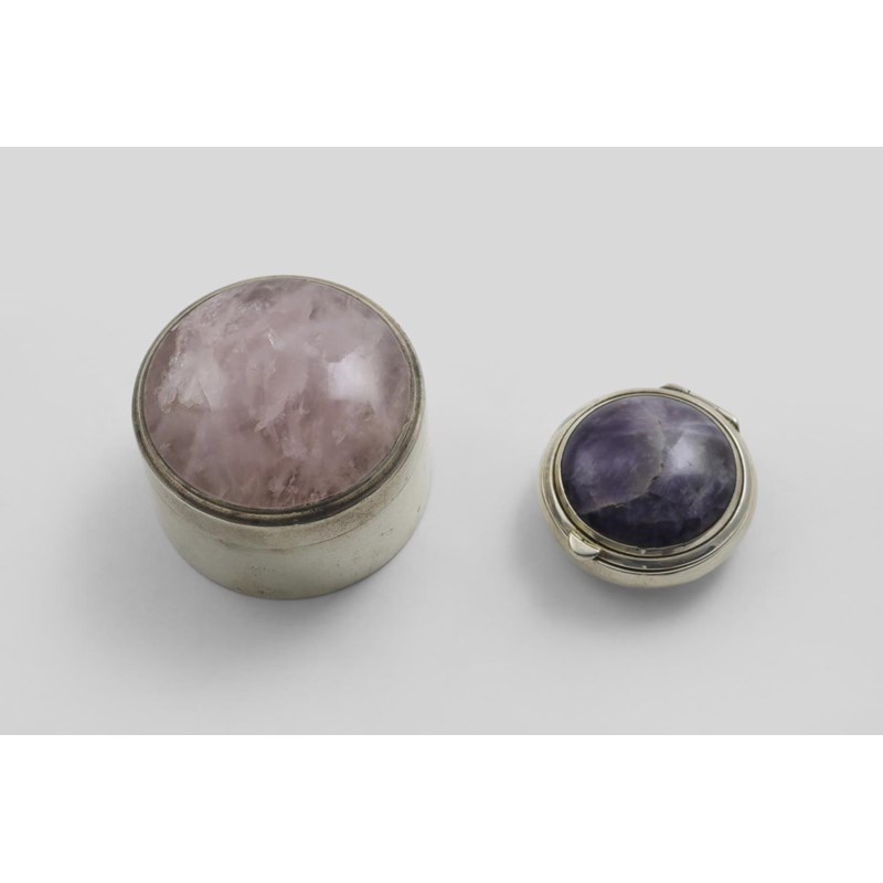 with a pull-off cover, set with a domed piece of rose quartz, gilt interior, by S. Mordan & Co., London 1919, together with a smaller, quartz circular box, set with amethyst quartz in the cover, by Levi and Salaman, Birmingham 1912; the larger one 2" (5 cms) diameter (2)