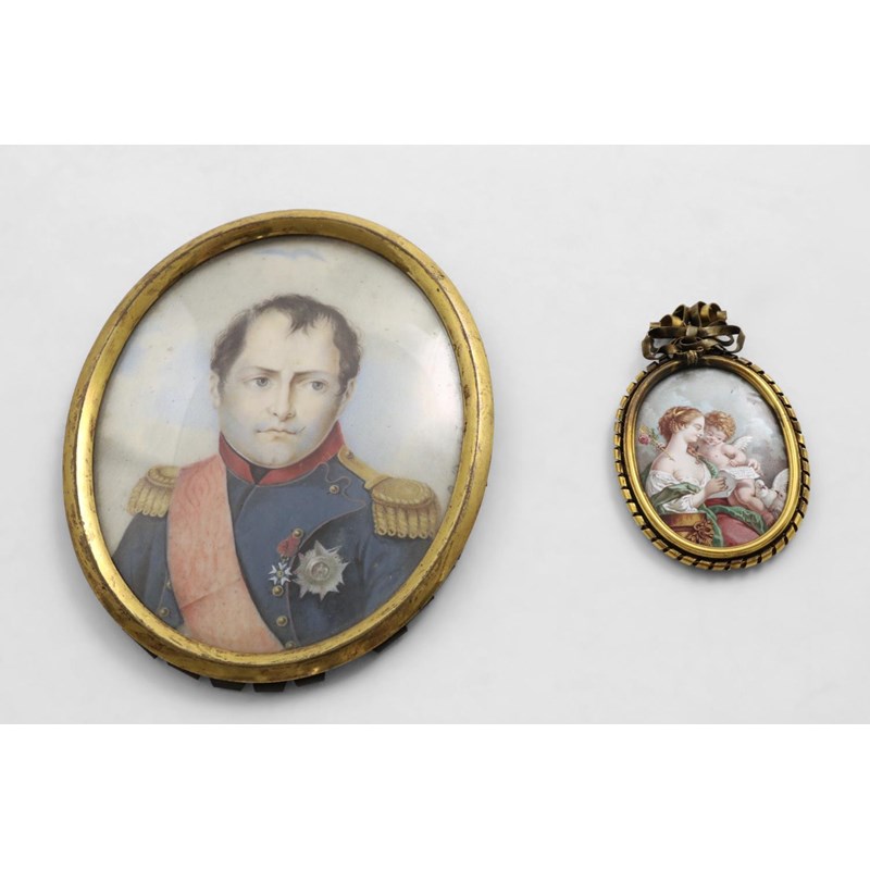 Portrait miniature of Napoleon, wearing uniform, head and shoulders, on ivory bears signature P.D. 1815; 9.5 x 7.5 cms and a miniature on enamel; The Love Letter 4 x 3 cms (2)