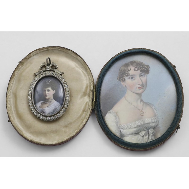 Miniature portrait of a lady wearing white dress and pearl necklace with Maltese Cross on ivory; 8.25 x 6.75 cms, in morocco outer case and a photo portrait of a lady on enamel; 3.5 x 2.5 cms in paste-set frame, c.1900 (2)