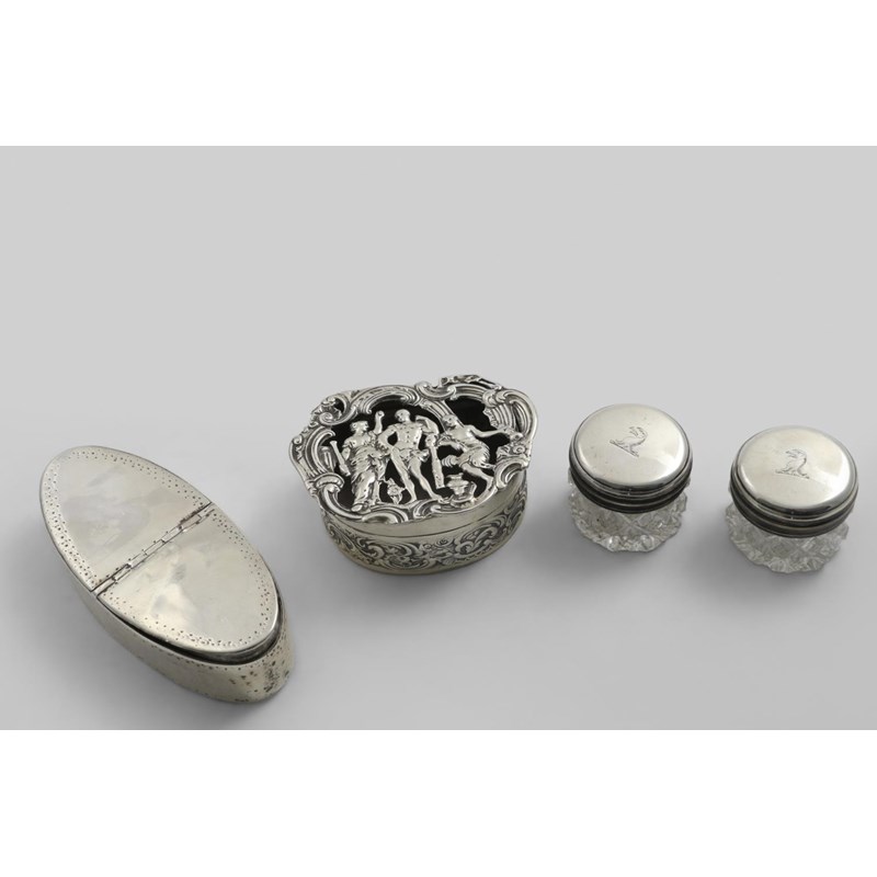 by William Comyns, London 1905, two small George III mounted cut-glass toilet jars, crested, by John Douglas, London 1818 and a George III navette-shaped snuff box with twin hinged covers & border engraving, gilt interiors, by Robert Nash, London 1782; the snuff box 3.75" (9.5 cms) long; 4.85 oz weighable silver (4)