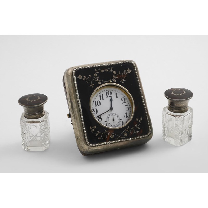 with inlaid decoration by William Comyns, London 1907, fitted with a plated "Goliath" pocket watch and two mounted cut-glass dressing table bottles; the watch case 4.5" (11.5 cms) high (3)
