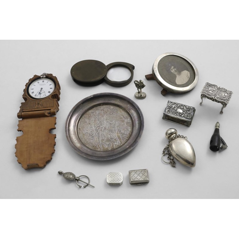 An Elizabeth II small Irish dish, etched with pheasants, by the Royal Irish Silver Co. with commemorative marks for Dublin 1973, a match box cover, a small frame, a carved wooden watch-stand with pocket watch, a horn magnifying glass, two small antique vinaigrettes, a Victorian scent bottle, a miniature table, etc.; the dish 4.75" (12 cms) diameter (lot)
