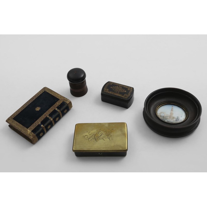 A MIXED LOT:- A papier-mache snuff box, a brass snuff box, initialled, a treen box, a novelty gilt-brass & velvet box resembling a book with a print inside and a small oval, framed miniature painting; the latter 3.5" (9 cms) long (5)