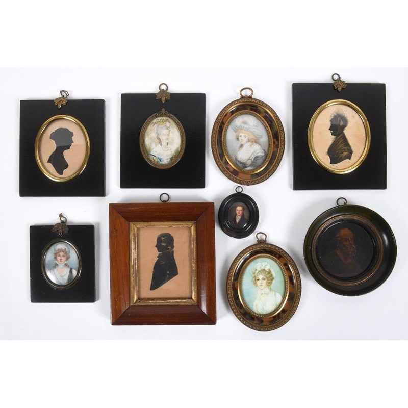 Nine various miniatures or silhouettes, including a pair of portraits in brass and simulated tortoiseshell frames; 8.6 cms, portrait of a young man on porcelain; 4 x 3.5 cms, c.1820