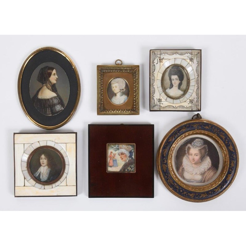 A GROUP OF MINIATURE PORTRAITS One of a lady wearing a headdress, figures behind (possibly Russian); 4 x 4 cms, on ivory, c.1910, another of a lady wearing a mantilla, perhaps Spanish; 8 x 6.5 cms and four others (6)