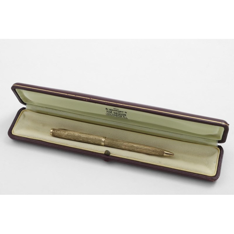 AN ELIZABETH II 9 ct. GOLD "TAYLOR PEN" a ball point with bark-textured finish, hallmarked London 1977 and contained in a leather case with retailer's name of Garrard & Co.Ltd,; the pen 5.25" (13.4 cms) long