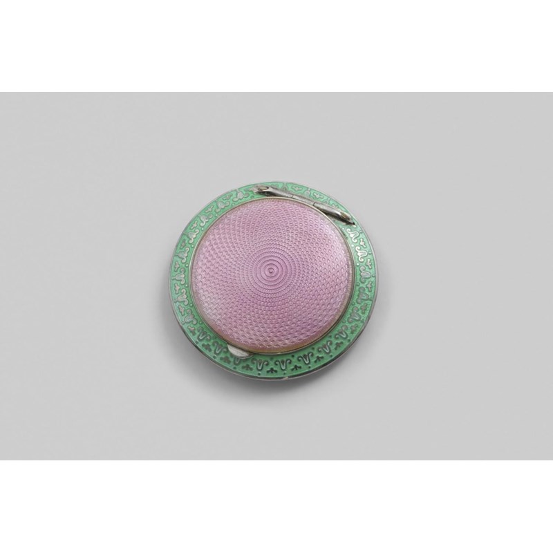 decorated in pink and light green over engine-turned decoration and a repeating border of scroll motifs, maker's mark "KF", Vienna c.1900; 2" (5 cms) diameter