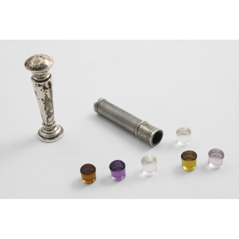 with six removable hardstone matrix inserts (each with a different message intaglio), unmarked, and a George V seal, by Sampson Mordan & Co., Chester 1916, initialled "G"; the latter 2.3" (6 cms) long (2)