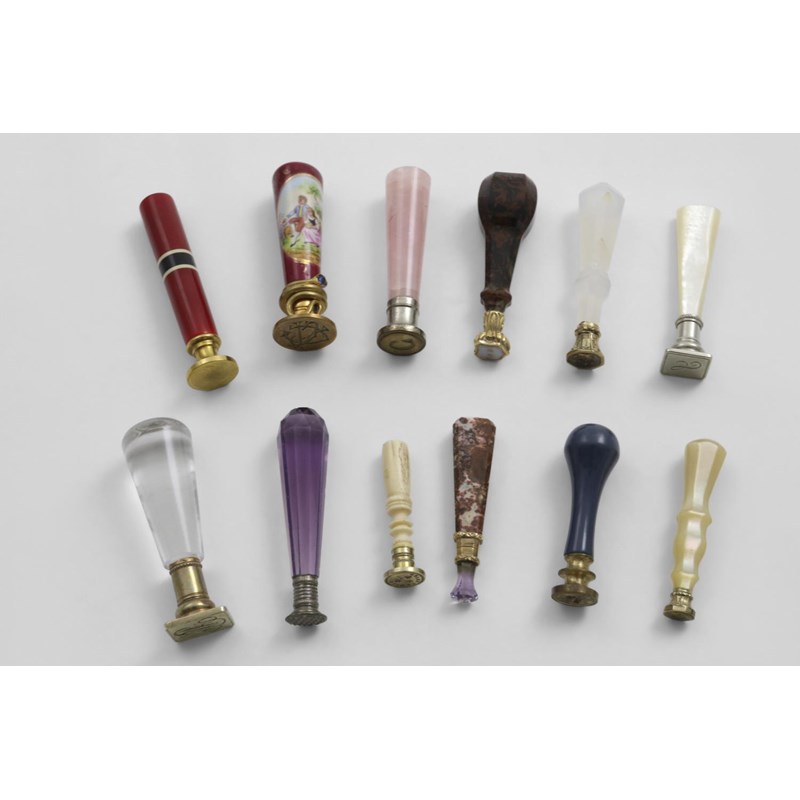 late 19th / early 20th century with either plated or gilt metal mounts, and handles in various mediums (mother-of- pearl, hardstone, glass, etc. & most with an engraved matrix; the largest one 2.75" (7 cms) long (12)