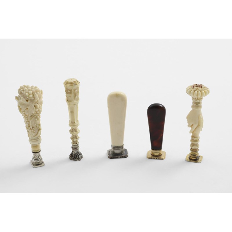 AN EDWARDIAN 9 CT. GOLD-MOUNTED TORTOISESHELL SEAL with intaglio crest & motto, by Sampson Mordan & Co., Chester 1908, another similar silver-mounted ivory example with initials by the same maker, Chester 1909 and three other antique, mounted & carved ivory seals (one with intaglio monogram & one incised "Annie"); the largest one 3" (7.5 cms) long (5)