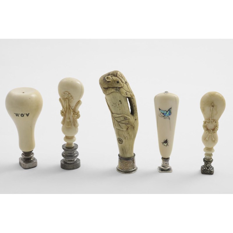 with a rat nibbling at leaves on a stem, initialled, a 19th century mounted steel & carved ivory seal, a Victorian mounted ivory seal with baluster handle, initialled "AOH", the bloodstone matrix with intaglio crest & initials "AOH", and two other mounted, carved ivory seals, (one with abalone inlay), initialled intaglio; the bone seal 4.4" (11 cms) long (5)