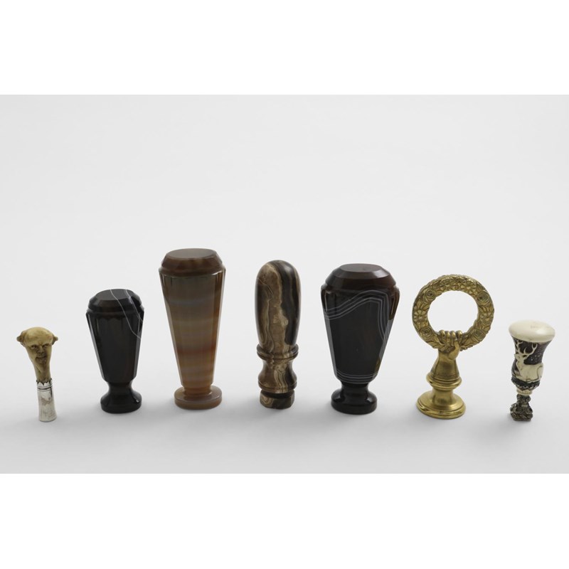 (one with intaglio monogram), two other hardstone seals (one initialled), a Victorian cast brass seal with a wreath handle, and two mounted antler seals, both with initials (one originally a pipe tamper); the largest one 4" (10 cms) long (7)