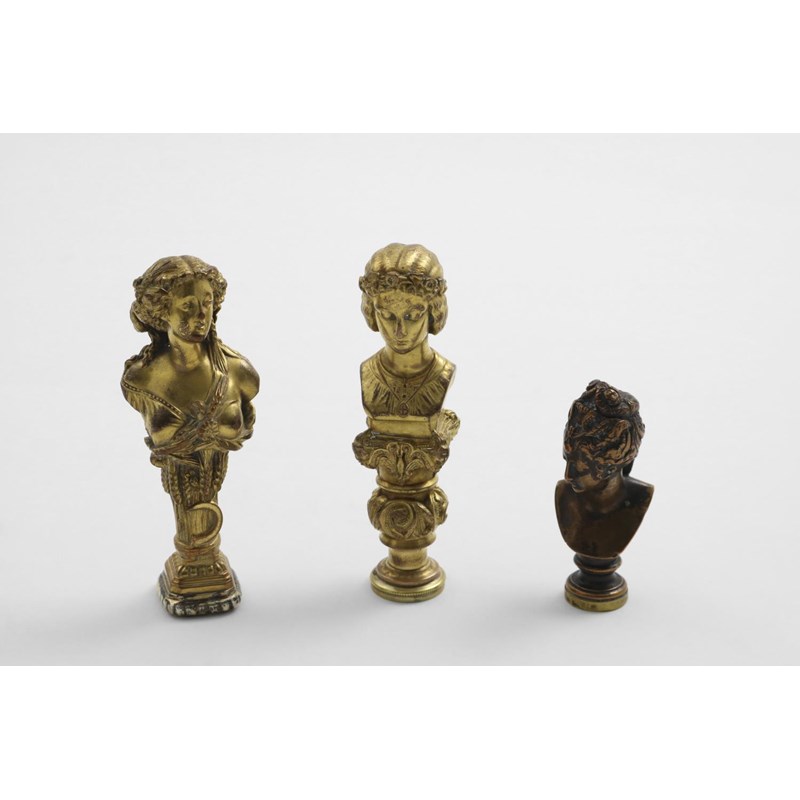 with intaglio coat of arms, cast in the form of a bust of a young girl, emblematic of summer, signed "Henry Cailleux" and stamped "F. Barbedienne & Cie", together with another gilt-metal seal with intaglio crest motto & initials, by the same maker & sculptor, and a small bronze seal with intaglio monogram stamped "F. Barbedienne"; the largest one 3.75" (9.5 cms) high (3)