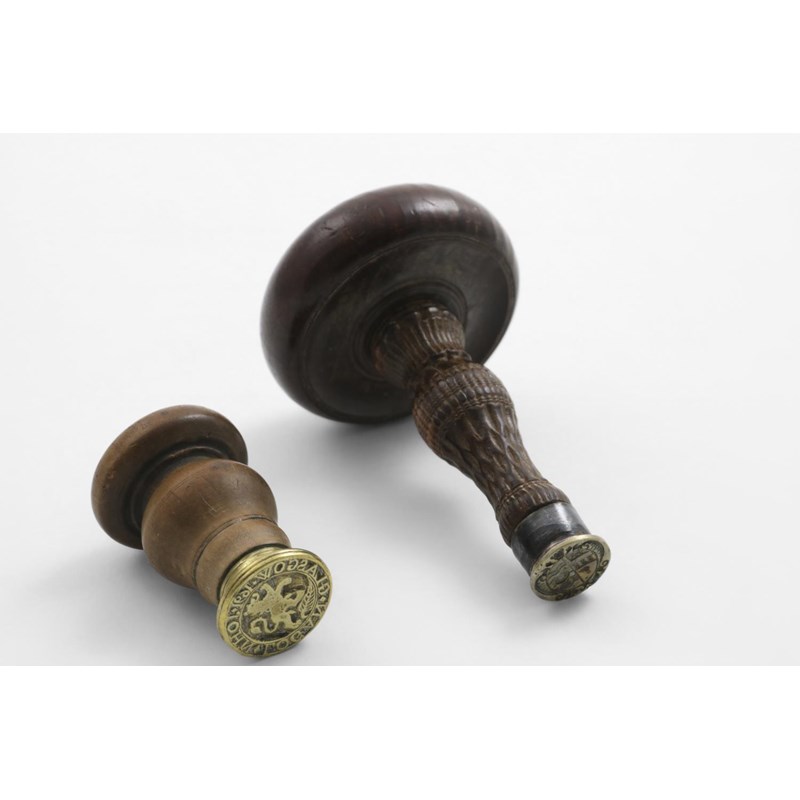 with a turned wooden handle, the matrix with intaglio rampant lion & leaf and "JOHN LOGAN GLASGOW 1691", together with a mounted wooden seal with a mushroom-shaped and engine-turned handle, and an intaglio coat of arms, early 18th century; the latter 4.25" (10.8 cm) long (2)