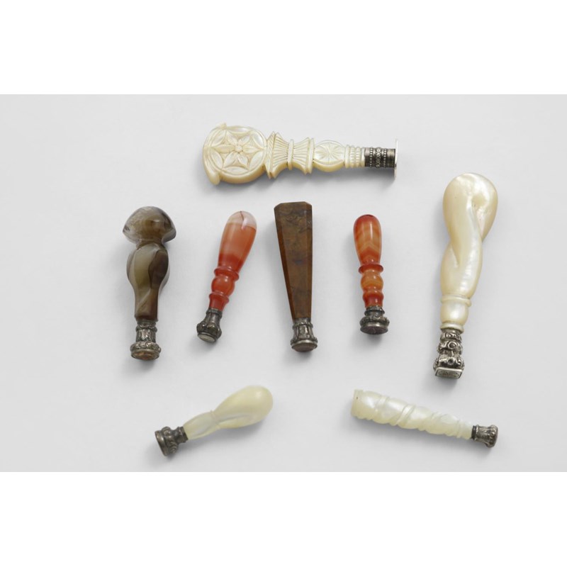 and four mounted mother-of-pearl seals, each with an engraved matrix; the largest one 3.11" (8 cms) long (8)