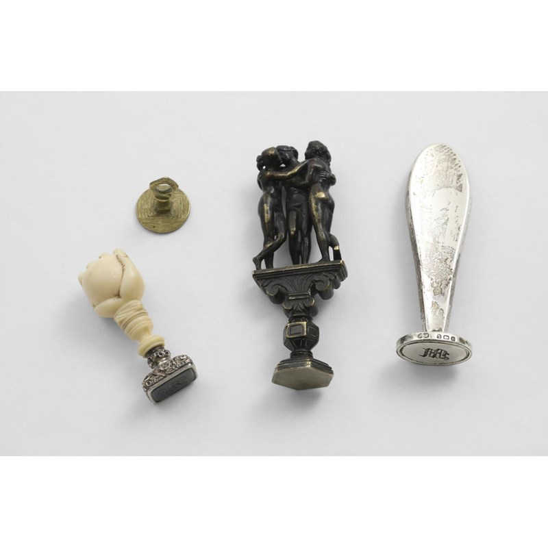 with the three graces on a pedestal, a small Islamic brass seal, inscribed, a small Victorian mounted, carved ivory seal with bloodstone matrix, & intaglio initials and an Edwardian seal, maker's mark worn, Birmingham 1906; the latter 3.3" (8.5 cms long (4)