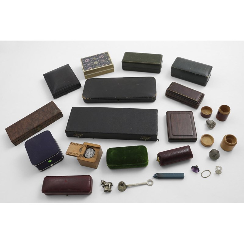 in a fitted case to include a pique-work dip-pen by Sampson Mordan & Co., a steel knife and a seal (lacking a penknife), an Art Deco cased writing set in two-coloured resin with brass mounts, together with a small quantity of seal boxes (empty), three small wooden boxes, each containing a steel seal matrix, a cased brass-mounted lens with a turned wooden handle, etc.; the lens 3.1" (8 cms) long (lot)