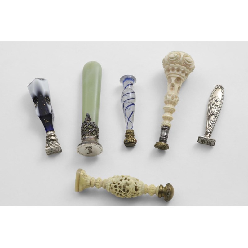 with intaglio initials, a Victorian brass-mounted glass seal with coloured air twist decoration, a French seal, initialled, a plated mounted soapstone seal, crested, and two antique carved ivory seals with brass mounts; the longest one 3.75" (9.5 cms) long (6)