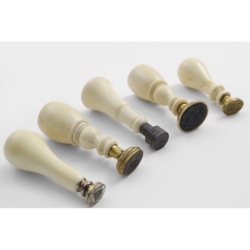 with a bronze and hardstone matrix and the Royal Arms of the Commissariat intaglio, together with four other ivory-handled seals with either steel or gilt metal matrixes, (one with the arms of the Country of Middlesex intaglio); the largest one 3.7" (9.3 cms) long (5)