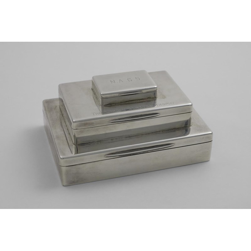 in the form of three boxes, one on top of the others (for cigars, cigarettes & vestas), inscribed "N.A.G.S. The Layton Scratch Trophy", the two larger boxes with cedar-wood linings, maker's mark "G.B", London 1912; 6.5" (16.5 cms) long