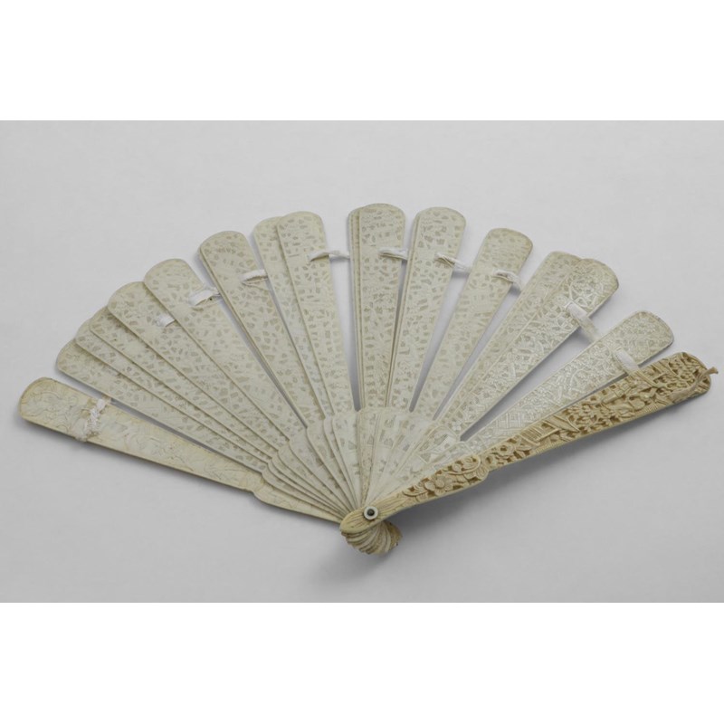 A 19TH CENTURY CHINESE BRISE IVORY FAN with carved end sticks, 1860-1880; 7.5" (19 cms) long
