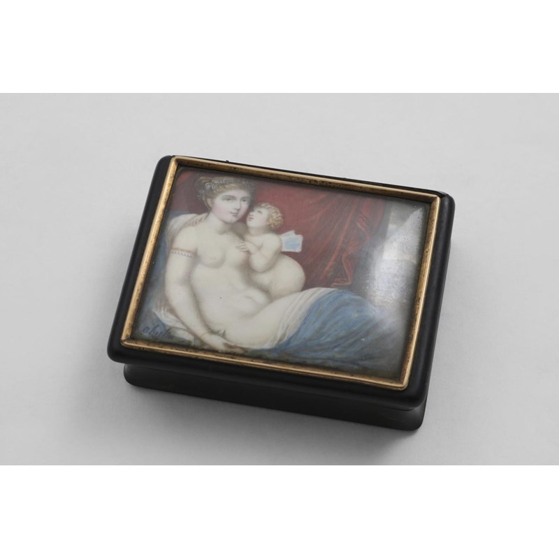 the cover inset with a miniature painting (behind glass), indistinctly signed bottom left corner, 1810-1830; 3.4" (8.5 cms) long