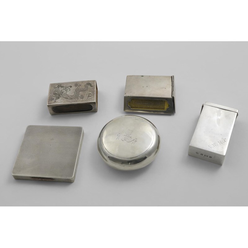 engraved with a dragon & monogrammed, another Chinse matchbox cover, shaped like a plain parallelogram, an Edwardian matchbox cover with a domed top, a late Victorian tobacco pebble, crested and an engine-turned compact, square with an applied gold thumbpiece, (the interior lacking its mirror); the latter 2.75" (7 cms) square; 9.25 oz weighable silver (5)