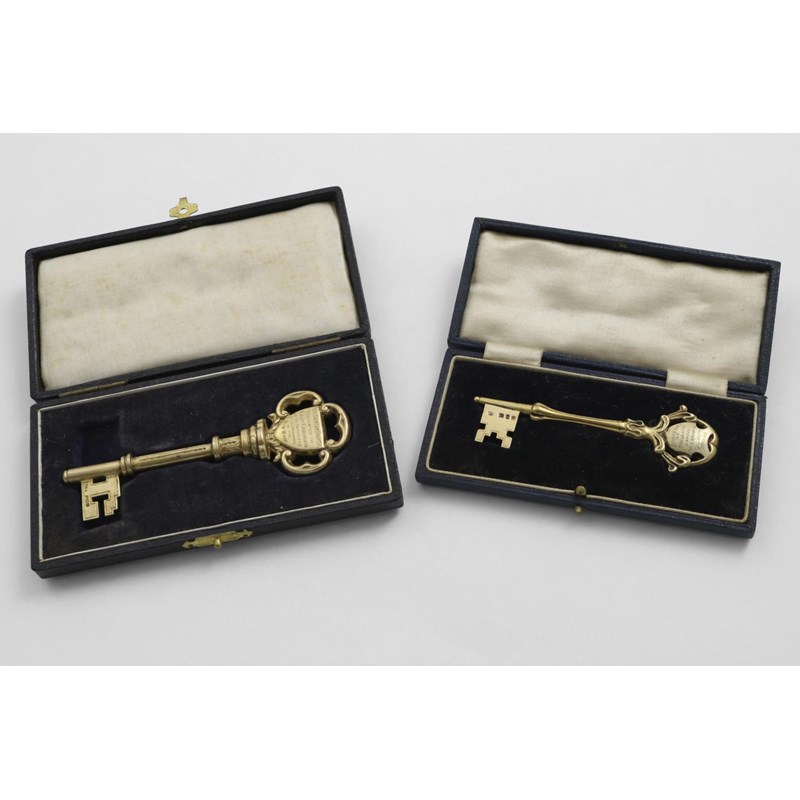 TWO GEORGE V SILVERGILT PRESENTATION KEYS each one inscribed and in a fitted case; the larger one 4.25" (11 cms) long; 2.1 oz (2)