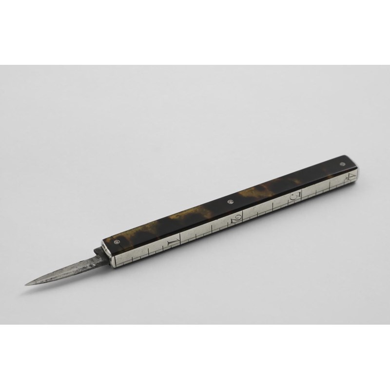 with slide-out action, the back calibrated for use as a 4 inch rule, the steel blades stamped "BENNET", probably late 18th / early 19th century; 4" (10 cms) long closed