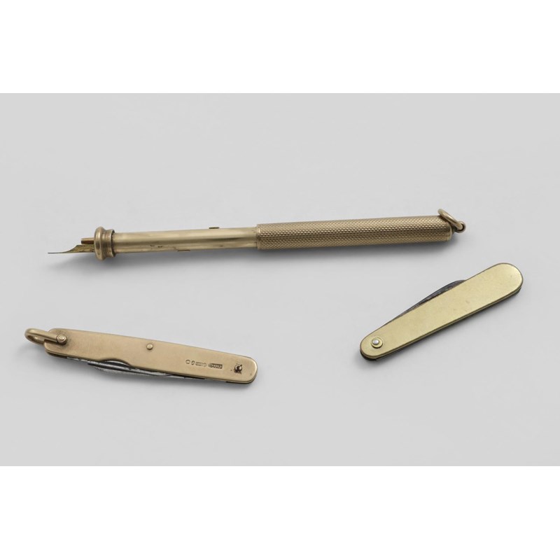 with slide action and an engine-turned barrel, inscribed "Jack from Betty 1923" and initialled "J.B.G", by Alfred Dunhill c.1923, together with a 9 ct. gold-mounted steel pocket knife by Sampson, Mordan & Co., London 1921, and a giltmetal-mounted pocket knife; the pencil 2.75" (7 cms) long (3)