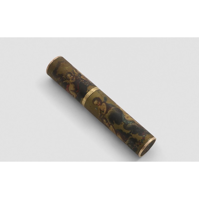 tubular with a pull-off cover, decorated in polychrome with playful putti & garlands of flowers; 4.9" (12.5 cms) long