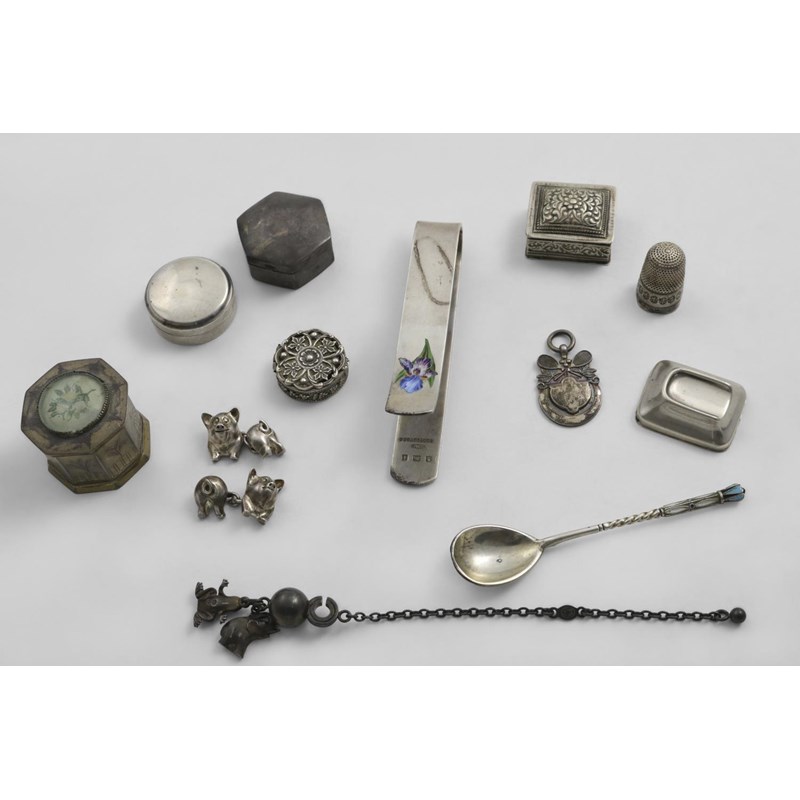 A Danish chain bracelet with pendant frog and elephant charm, by Georg Jensen, a small Swedish engraved silvergilt box, by P.A. Thomasson, Karlskrona 1862, four other boxes, an Edwardian enamelled bookmark, a Russian spoon, a pair of sleeve links, etc; the bookmark 4" (10 cms) long; 6 oz weighable silver (lot)