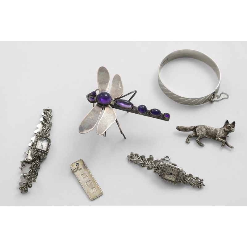 two marcasite-set lady's cocktail wristwatches by Effee, a pendant, a fox brooch and a dragonfly set with amethyst quartz beads; the latter 3" (7.5 cms) long; 2.4 oz weighable silver (6)