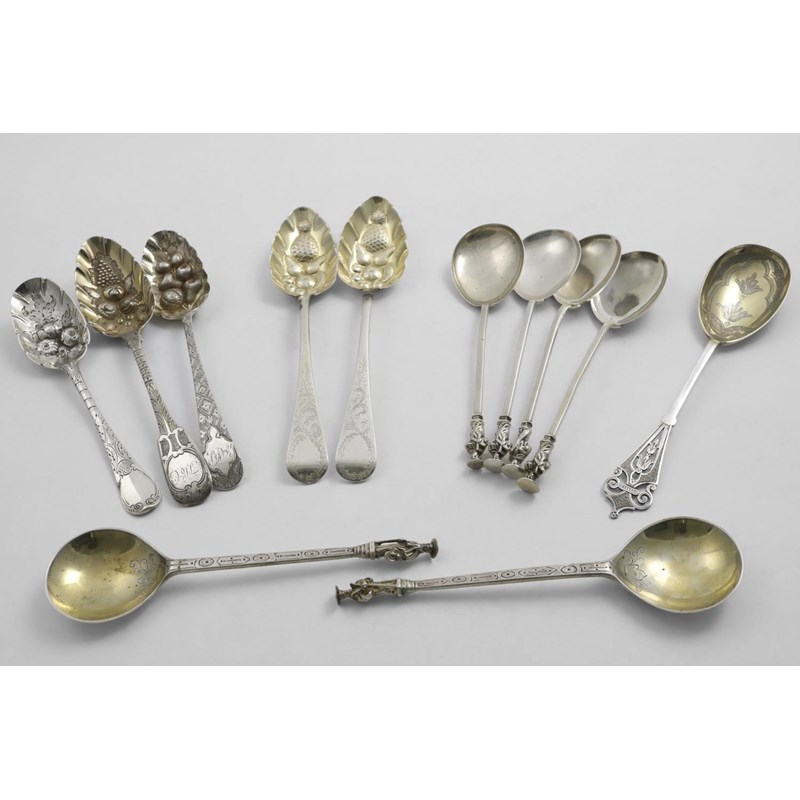 (two with initials), a Victorian fruit serving spoon with a pierced terminal, and six various spoons with apostle-figure terminals; the pierced spoon 8.7" (22 cms) long; 21.5 oz (12)