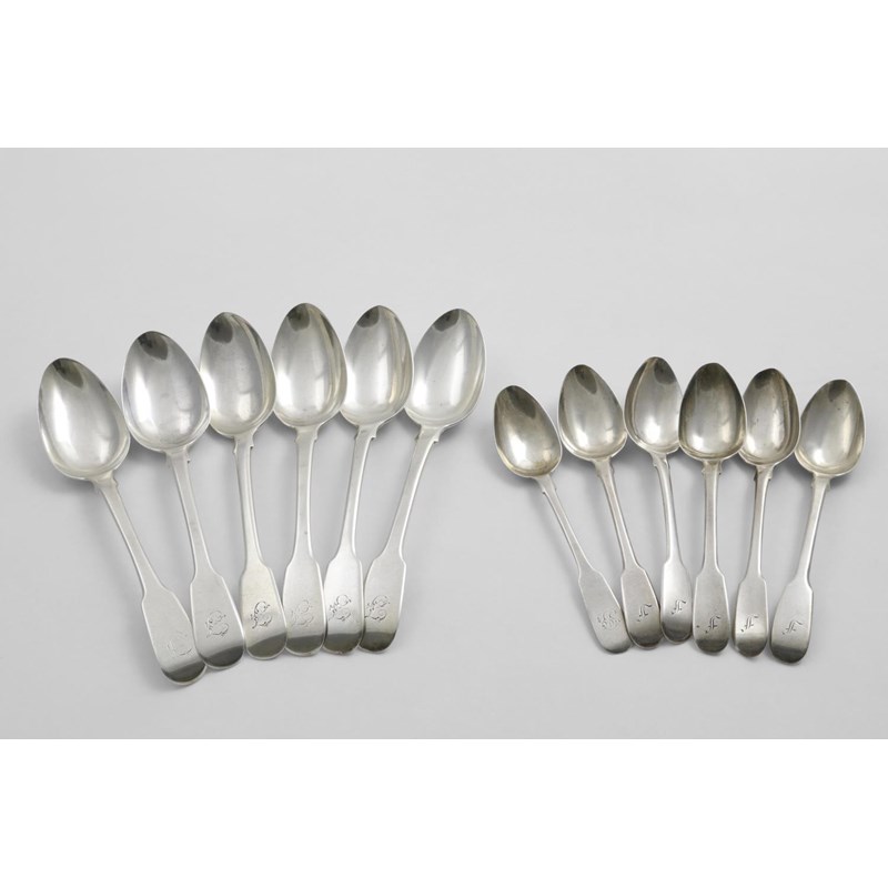 initialled "F", by William Eley & William Fearn, London 1814/17, a set of five Fiddle tea spoons, initialled "F", by Messrs. Eley, Fearn & Chawner, London 1812 and another non-matching tea spoon, initialled "SB"; 11.7 oz (12)