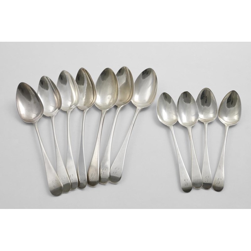 and four dessert spoons, all initialled "G", by various makers (Peter & William Bateman, Eley & Fearn and Eley, Fearn & Chawner), London 1805/06/09; 18.3 oz (11)