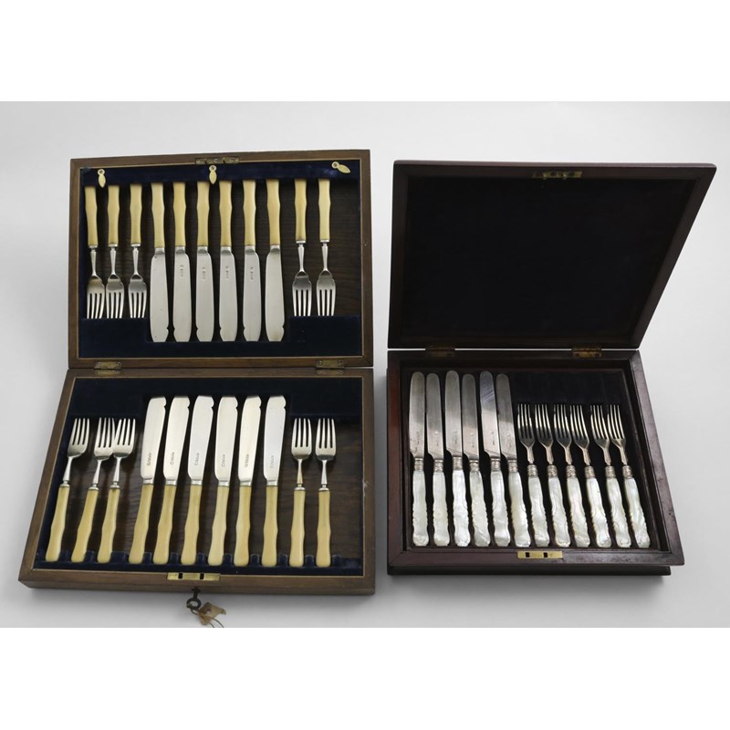 by Charles Boyton & Sons, Sheffield 1918/19 and a box containing six Victorian dessert knives and six dessert forks with mother of pearl handles; the box 11" (28 cms) long (2)