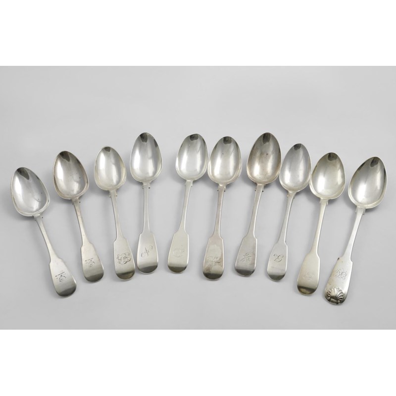 SEVEN VARIOUS ANTIQUE FIDDLE PATTERN TABLE SPOONS initialled, a pair of George IV Irish Fiddle rattail table spoons, crested, and a Newcastle-made Fiddle & Shell pattern table spoon, initialled; 23.95 oz (10)
