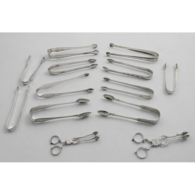 Four pairs of Exeter-made sugar tongs, an Irish pair, a Scottish provincial pair (by Robert Keay of Perth), two pairs of sugar nips, a pair of unascribed sugar tong with curious marks (WA, and a man on a horse), and four other pairs of Victorian sugar tongs; 13.8 oz (13)