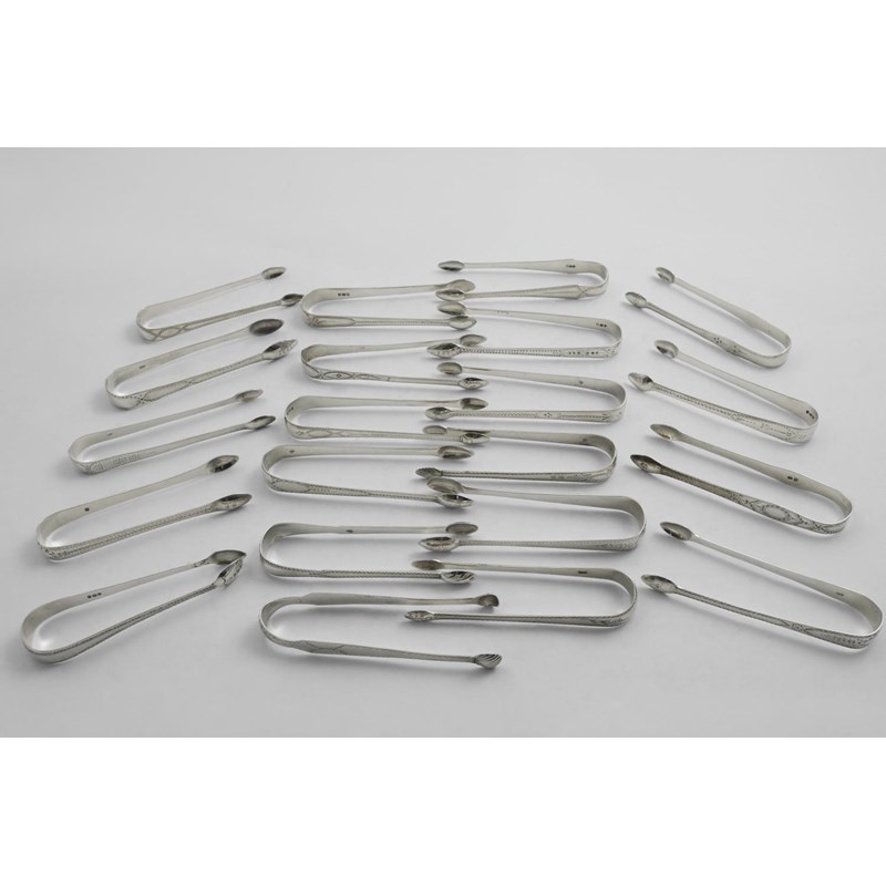 TWENTY-ONE PAIRS OF GEORGE III LONDON-MARKED SUGAR TONGS with bright-cut decoration, mixed makers and dates; 20.5 oz (21)