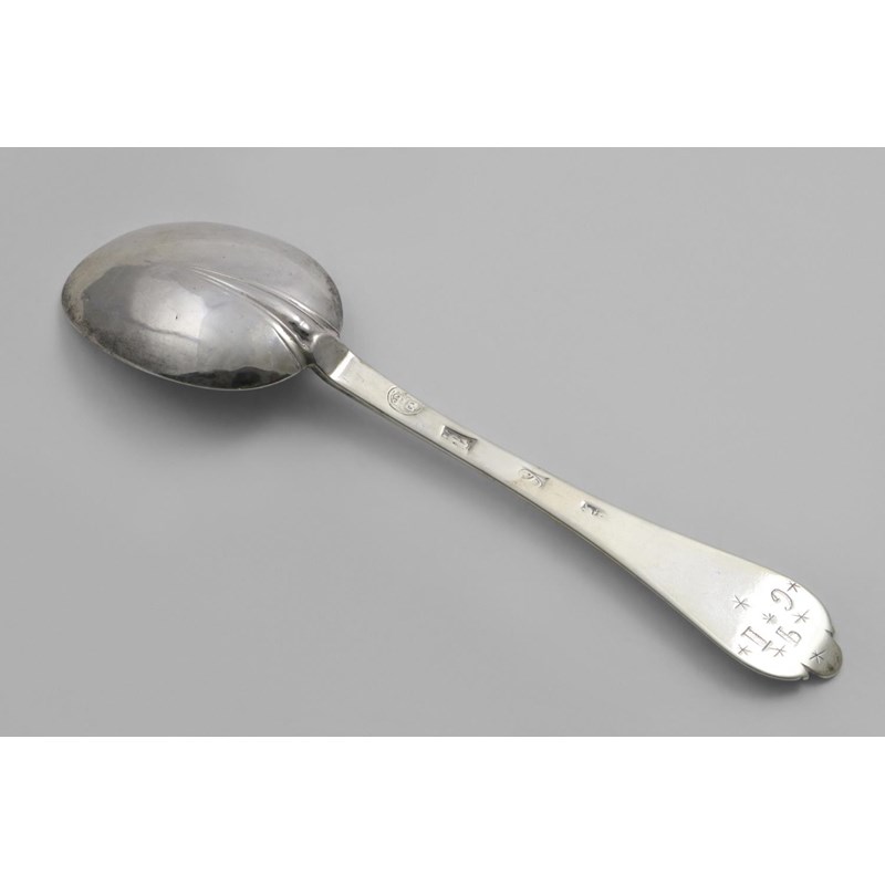 A WILLIAM III TREFID TABLE SPOON with a thread-bordered rattail and the scratched initials "q" over "GI" (with mullets) on the back of the terminal, by William Petley, London 1699; 7.2" (18.2 cms) long; 1.1 oz