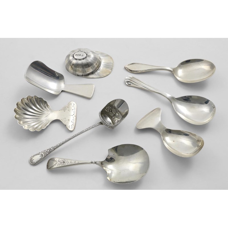EIGHT VARIOUS GEORGE V CADDY SPOONS including a "jockey cap", mixed makers & dates; the longest one 4.3" (11 cms) long; 4.1 oz (8)