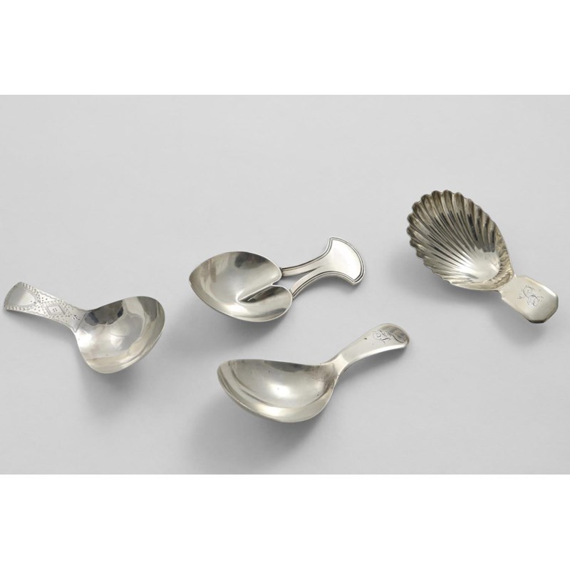 with a bowl-shaped like a lily pad and a bifurcated, thread-bordered handle, by Josiah Snatt, London 1808 and thee other caddy spoons by the same maker (two initialled), London 1802/06/10; the longest one 3.1" (8 cms) long; 1.1 oz (4)
