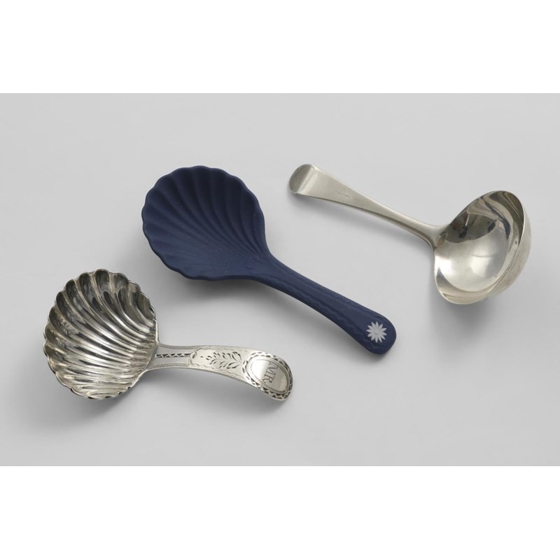 by Richard Crossley, London 1785, another with a fluted bowl and engraved stem, initialled, by John Lambe, also London 1785 (both with incuse duty marks) and a 20th century two-colour Jasperware porcelain caddy spoon by Wedgwood (Wedgwood England); the latter 3.5" ( cms) long; 0.8 oz weighable silver (3)