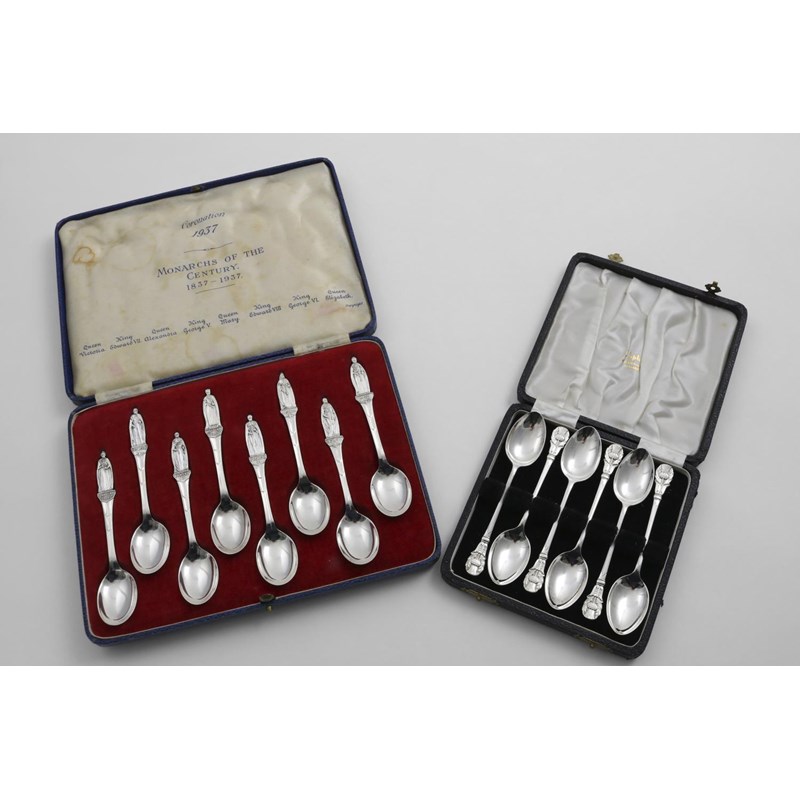 AN EDWARD VIII CASED SET OF EIGHT TEA SPOONS each representing one of the "Monarchs of the century 1836-1937", by Charles Boyton & Sons, Sheffield 1936 and a cased set of six tea spoons with thistle terminals; 7 oz (2)